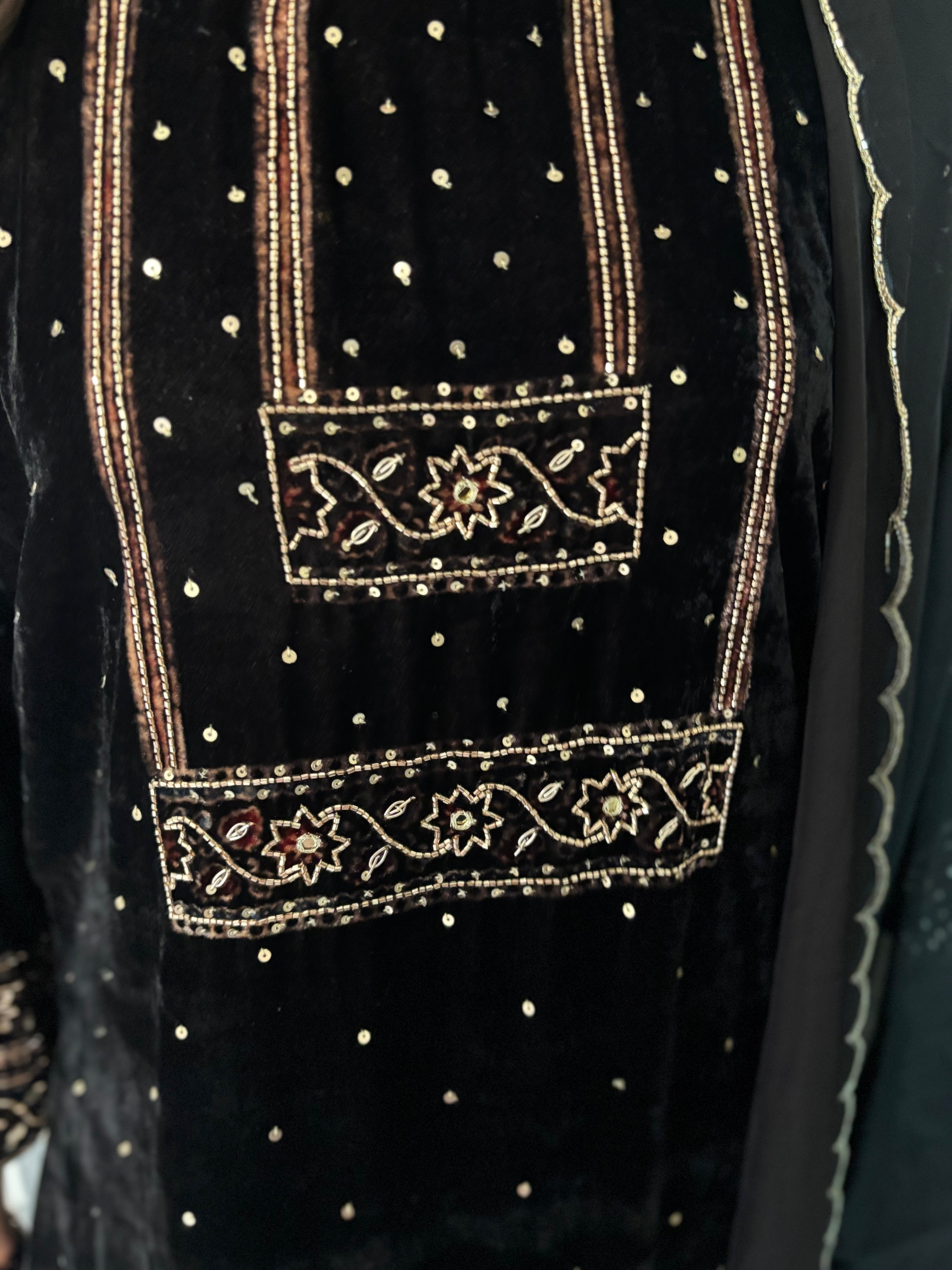Premium Handblocked Ajrakh Velvet Silk Handworked Top, paired with a matching Velvet Silk Bottom and an elegant Organza Dupatta detailed with Cutdana Scalloping 3 piece set stitched